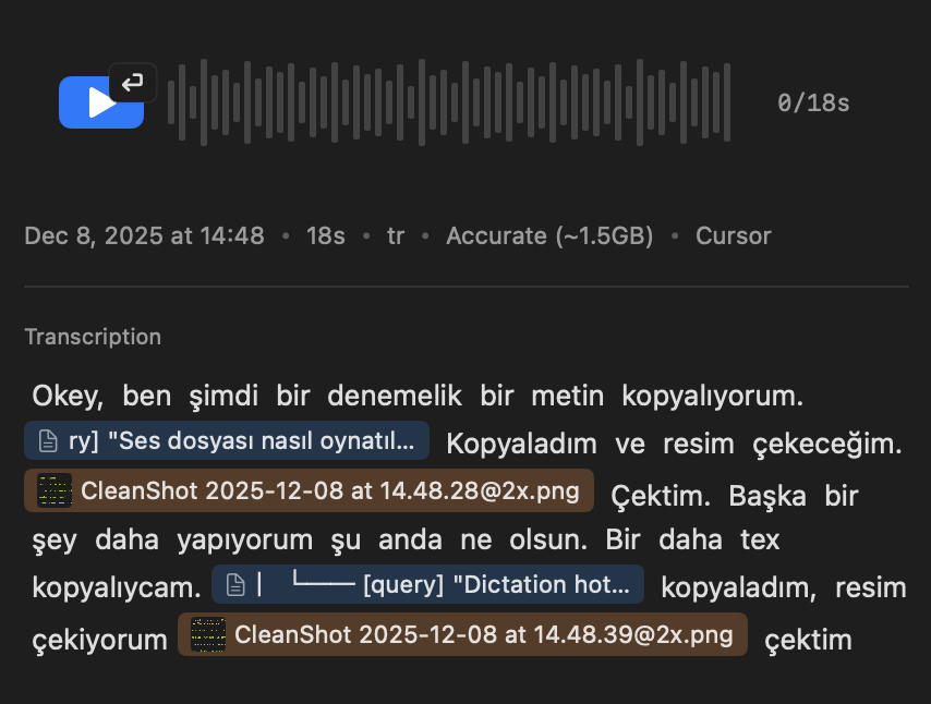 Çözüm: Durduğum anda transkripsiyon. Cümle bitmesini beklemiyor. Konuşma bittiği an metin hazır — düşüncemi bitirdiğim anda çıktıyı alıp AI'a atabiliyorum.
